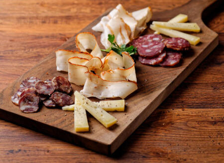 Charcuterie board - arrangement of assorted meats, cheeses, crackers, jams and honey - 10g